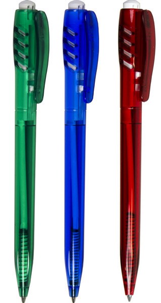 Шариковая автоматическая ручка. Корпус с гладкой полированной поверхностью из полупрозрачного пластика разных цветов. Нажимной механизм. Чернила синие. Вставка белого цвета.
